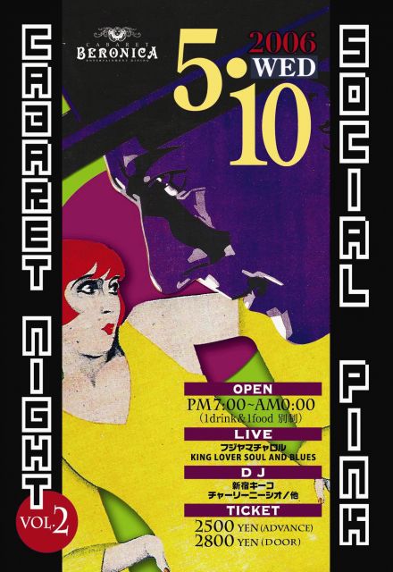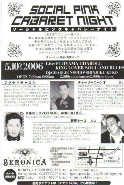 ソーシャルピンクキャバレーナイト! 1930年代ニューヨーク 黒人達が踊り狂ったハーレムジャズクラブ。そこに流れる小松みどり(五月みどりの妹なのに何故か名前が同じ)の「コチョコチョ娘」そんな? イベントです。わかるかな〜わかんねだろうな〜! 7時Opem 8時〜もしエルビスが黒人だったら?をテーマにした新人バンドKingLoverSoul&Bluesのライブ 9時半〜ソーピンのホストバンド フジヤマチャロル DJは、新宿キーコとチャーリーニーシオ スイングの新潮流イベントだ! お食事のメニューも充実! 前売り2500円当日2800円(1フ