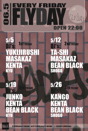 ■EVERY FRIDAY FLYDAY■ 2006.5.12.(Fri) @千葉 BELT (TEL043-222-2771 / http://club-belt.com) open 22:00- 2500yen/1-drink w/f2000 yen/1-drink ~24:00,1000yen dj's ■ Ta-shi ■ masakaz ■ bean black ■ hiroki ■ shogo ■ 10half ■ koba 今、話題のmixCD『Vynal Munchiez』をリリースしたDJ ta-shiが千葉 BELTで回しますっ!ta-shiさんの生のプレイを観てガンガン盛り上がってしまいましょうっ!!