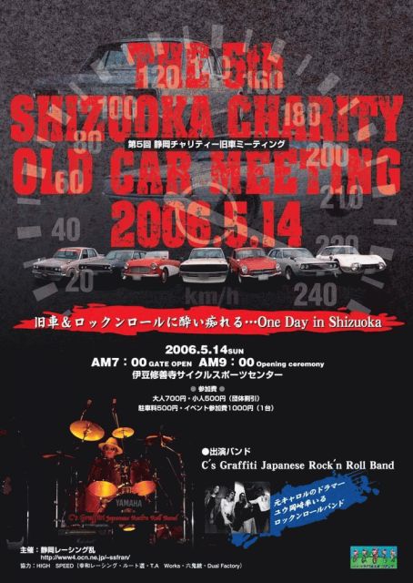 2006.5.14(SUN) 伊豆修善寺サイクルスポーツセンター AM 7:00 GateOpen AM 9:00 OpeningCeremony 旧車イベントにC's Graffiti Japanese Rock'n Roll Band が出演いたします。 詳細未定 後日掲載いたします。 http://www4.ocn.ne.jp/~ssfran/ http://www.dual-factory.net/