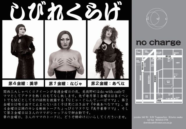 関西三大しゃべくりクイーンが毎週金曜日の夜、兎我野町はdo with cafeでママとしてアナタを熱くおもてなし致します。先ず毎月第1金曜日は各イベントでもMCとしてその話術を披露する『なじゃ・ぐらんでぃーばママ』、第2金曜日は喋り出すと止まらない泣く子は更に泣き出す『中森あべなママ』、第4金曜日は頭のキレる斬新トークちょっぴりマヌケな『美芋豪華ママ』、そして第3金曜日は3人のママがシャッフルで御出勤です。華の金曜日、3人のママのトークに、どうぞ腰砕けにいらして