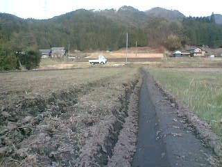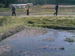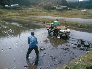 5/21(日)【田植え会】のご案内 【稲作作りの様子】 4月の初めに『いざらい』しました。 毎年この時期に部落総出(25人?)で用水路の砂・石・草などを末端から取水口まで約1?余りを掃除しました。 4月中頃には『畦塗り』をしました。 …といっても知り合いの業者さんに頼んで、トラクターに装着した機会でドドンドン!…と驚くくらいにアッいう間に出来てしまいました。 畦塗りは田んぼの則面の蛙・モグラなどによる穴を塞ぐために行います。 来週には『代かき』(かき混ぜて平らにならす)をします。 「田植え会」の田