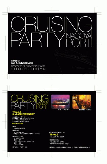 ☆☆☆☆☆☆☆☆☆☆☆☆☆☆☆☆☆☆☆☆☆☆☆☆☆ 【5.21.SUN】 Three.3 ☆3nd ANNIVERSARY☆ 名古屋港クルーズパーティー 名古屋港を2時間クルージングしながらシャンパン&ワイン&ディナーで大人の時間を楽しみましょう。 【ドレスコードが有ります】 300人程乗船できる船ですが(ゆとり)のある空間を演出したいので ☆乗船人数120名限定☆ (1F)メインフロア72席 (2F)サロンフロア48席 (2F)オープンデッキ36席 【フリー飲料】シャンパン.ワイン.ソフトドリンク