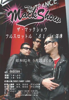 5/21(sun) ザ・マックショウ・ツアー2006 『フルスロットル'81』in 沼津 沼津オーディション Open 18:00 Start 18:30 Ticket \3500(adv) \4500(door) 別途1drink代 \500 出演 Shout (CAROLカバー) Candy Lacks (オールディーズ) 問い合わせ 沼津audition 055-926-0656 主催者 Mr・ELK(ペペ) e-mail / elk_viking@hotmail.co.jpまで! チケット枚数限定発売、売り切れ御免!!です。