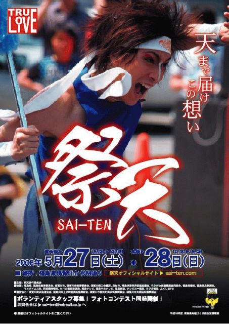 今年の『2006 祭天』は二日間です! 前夜祭!5月27日(土) PM6:00〜PM8:00 本 祭!5月28日(日) AM10:00〜PM7:00 2005年!福島県須賀川市に誕生したお祭りです! すべての人が創り人 見ている人もボランティアスタッフも参加者も 祭りの創り人 子供から大人まで一緒に創り楽しむ祭り 私達はこのお祭りがジャンルの枠を越え ひとつになれる祭りとして 須賀川から発信し続けたいと願います。 一緒に祭り創りしませんか? ボランティアスタッフ等!随時募集中です! よろしくお願いします! 詳しくは