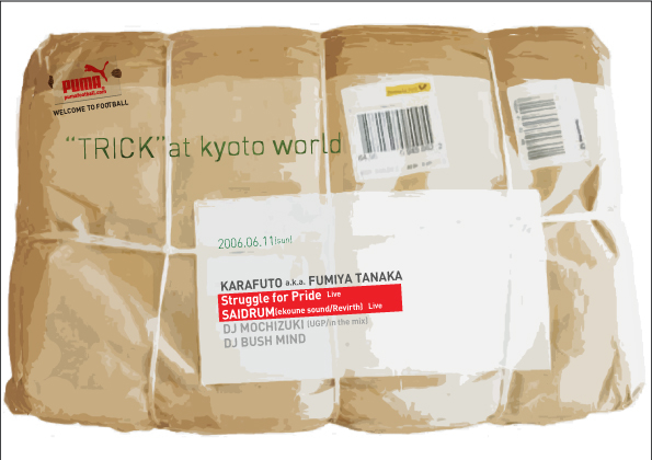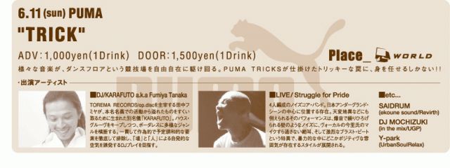 PUMAが贈る異次元・多次元的サウンドフィールド=“TRICK”at 京都WORLD! 今回はKARAFUTO、STRUGGLE FOR PRIDE、BUSHMIND、SAIDRUM、DJ MOCHIZUKI、という東西リアル・ハードコア・アーティスト×5を擁する、奇跡のフォーメーション