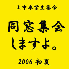 えー、暫定的ではありますが同学年のまぜこぜ集会 したいと思います!! 参加できる人は、他の上中メンツも誘ってmixi やってない人も誘ってやって!! 地元離れた人なんか特に参加してミソ。 詳しくは徐々に決めていきますので☆ よろぴく〜!
