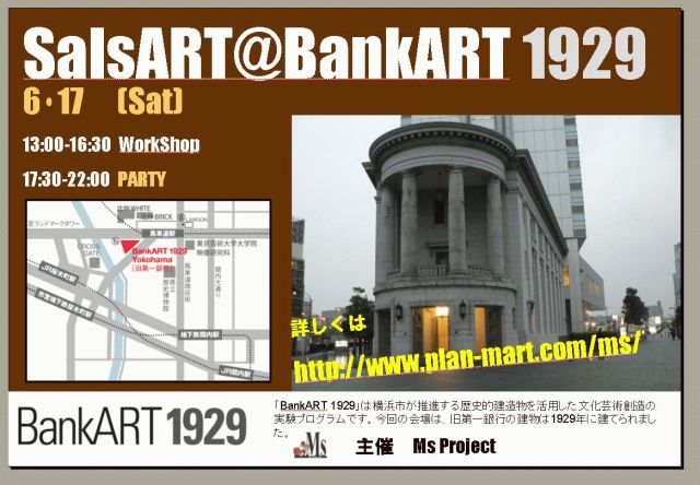 今までにこんなサルサ・イベントがあったでしょうか? 私たちは挑戦します。 SALSAがARTとして認められた=「SalsART @ 1929」 横浜歴史的建造物 BankART1929 全館が1日中ラテン一色に染まります。 SalsART@BankART 1929 http://www.plan-mart.com/ms/index.html ☆日時:6月17日(土)13:00-22:00 ★場所:BankART 1929 http://www.bankart1929.com みなとみらい線・馬車道駅下車 1b出口直結 JR 桜木町駅徒歩5分 ■料金 SalsART ★Party ・¥2500(w1d)[夜] 1ワークショップのみ [昼]・¥2000 1ワークショ