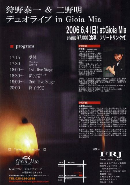 ¼íÌîÂÙ°ì¡õÆóÌîÌÀ¥Ç¥£¥ª¥é¥¤¥Öin Gioia Mia charge:¡ï7000¡Ê¿©»ö¡¢¥Õ¥ê¡¼¥É¥ê¥ó¥¯ÉÕ¤¡Ë ¥×¥í¥°¥é¥à 17¡§15¡¡¡¡¼õÉÕ 17¡§30¡¡¡¡¥Ç¥£¥Ê¡¼¥¹¥¿¡¼¥È 18¡§00¡¡¡¡1st.live Stage 18¡§30¡¡¡¡Àꤤ¥ï¥ó¥Ý¥¤¥ó¥È¥¢¥É¥Ð¥¤¥¹ 19¡§00¡¡¡¡2nd.live Stage 20¡§00¡¡¡¡½ªÎ»Í½Äê ¼ÄÅ«¤È¥Ô¥¢¥Î¤Î¥Ç¥£¥ª¥é¥¤¥Ö¤Ç¤¹¡£ Ê·°Ïµ¤Îɤ¤¥¤¥¿¥ê¥¢¥ó¥ì¥¹¥È¥é¥ó¤Ç ÁÇŨ¤Ê¤ª¿©»ö¤È±éÁÕ²ñ¡¢¤½¤·¤ÆÀꤤ¤â³Ú¤·¤á¤Þ¤¹¡£ ¶¨»¿¡¡£Æ£Ò£Ê¡§forerunner japan ¡Ö ¡¡?¥Ò¥í¥¿¥«¥Ç¥¶¥¤¥ó¡¢ ¡¡?¥¹¥ï¥ó¥ì¥¤¥¯¥Ó¡¼¥ë¡¦¸Þ½½ÍòÅ¡¥¬¡¼¥Ç¥ó ¡¡(Í)¥¯¥é¥ë¥Æ¡¡E