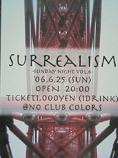 ¡ØSurrealism -Sunday Night vol.6-¡Ù ¡¡¡¡@No Club Colors (¿·³ã/¸ÅÄ® ¸ÅÄ®¥Ó¥ë£²F) ¡¡¡ÎDate¡Ï 2006.06.25.Sun ¡¡¡ÎOpen¡Ï 20:00 ¡¡¡ÎTicket¡Ï 1000yen/1drink ¡¡¡ÎGenre¡Ï¡¡House/Dance Classic/Hip Hop ¡¡¡ÎDJ¡Ï TAKA ¡¡¡¡¡¡¡¡ KATSUYA ¡¡¡¡¡¡¡¡ MICHI ¡¡¡¡¡¡¡¡ HIRO ¡¡¡¡¡¡¡¡ HANU ¡¡¡¡¡¡¡¡ JUNichiro ¡¡¡¡¡¡¡¡ SHINOBU