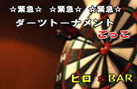 栄光を我が手に! 豪華賞品獲得を夢見ながら☆ 栄誉あるダーツマスターの称号をめざそう♪ 【ゲームプラン】 ・シングルトーナメント ・チーム(2人一組)トーナメント ※男女混合ペア戦 【賞品】 シングル1位者 チーム1位組に用意しております。 ※シングルトーナメント男性の最下位の方には罰ゲームがあります。 【参加費】 ¥300円-(ダーツトーナメントエントリー費※賞品代に当てられます。) ¥1000円(しっぽり軽食コース+飲み放題付) ※飲み放題は現在:ワイン、カクテル、ソフトドリンク