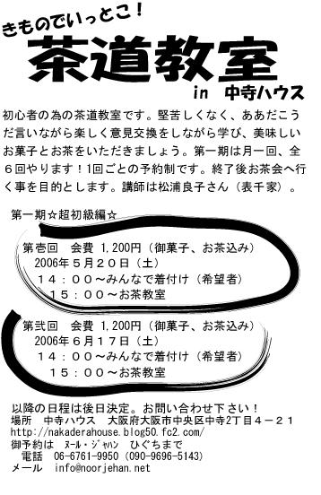 初心者の為の茶道教室です。 堅苦しくなく、ああだこうだ言いながら楽しく意見交換をしながら学び、美味しいお菓子とお茶をいただきましょう。 第一期は月一回、全6回やります! 1回ごとの予約制です。 毎回開催前に着付けもします〜 来れる日に参加してね〜。 6回終了後お茶会へ行く事を目的とします。 講師は松浦良子さん(表千家)。 各回定員10名 きものでいっとこ!第一期☆超初級編☆ 第弐回 会費 1,200円(御菓子、お茶込み) 2006年6月17日(土) 一部 12:00〜みんなで着付け(希望者)