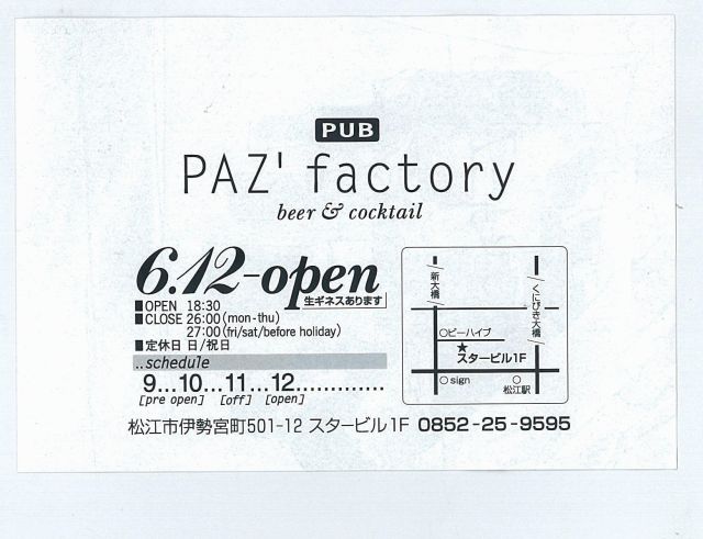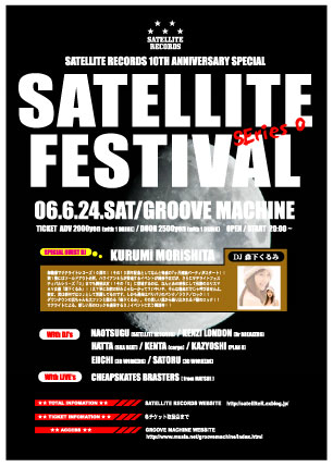 サテライトレコーズ10周年記念 「SATELLITE FESTIVAL 〜シリーズゼロ〜」 6月24日(土)松江グルーブマシン 前売券2000円 当日券2500円 (ワンドリンク付き) スペシャルゲストDJ 森下くるみ DJ NAOTSUGU(SATELLITE RECORDS)/KENTA(cargo) KENZI LONDON(Dr breakers)/KAZYOSHI(PLAN8) /EIICHI&SATORU(3D WORKERS) 88(FREEDOM SOUNDS) BAND CHEAPSKATES BRASTERS ハワイアン6らを招いて行