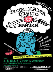 [ 堀川DISCO遊覧船 ] DATE: 2006.6.7 WED VENUE: HYDRO REACTION (0852-25-8590) GUEST: 槙原伸治 DJS: NAOKI, TACKY, KAZUKI, MATSU LIVE: NIELLO FEE: 1000YENw/1d URL: http://www.horikawa-disco.com 毎月第一水曜開催の「堀川ディスコ」も気が付いたら一周年!ゲストに槙原伸治を迎えてのアニヴァーサリは本日9時開演!です! HOUSEあり、R&Bあり、BREAKBEATSあり、DRUM'N BASSあり、○○○あり、の×××なひとときを是非お楽しみくださいー。