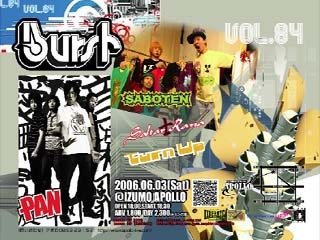 OPEN 18:00/START 18:30 ADV ¥1,800/DAY ¥2,300 (ドリンク別) 【出演】 SABOTEN PAN Saltar±Rana Turn up 【ローソンチケット】 Lコード 69959 (発売日:4/16) 【BURST HP】 http://ip.tosp.co.jp/i.asp?i=burst2311 ※イベント企画者は「スッスー」です。 このページでの企画者欄は、このコミュの管理人です。