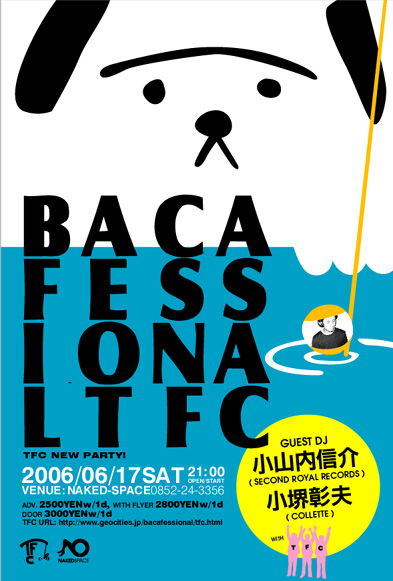 島根県松江市でイベントです。 告知させてください。 [ BACAFESSIONAL ] DATE: 2006.6.17 SAT 21:00OPEN/START VENUE: NAKED-SPACE( http://www.naked-space.com ) GUEST DJ: 小山内信介 ( SECOND ROYAL RECORDS ) 小堺彰夫 ( COLLETTE ) DJS: TFC FEE: ADV_2500YENw/1d, WITHFLYER_2800YENw/1d, DOOR_3000YENw/1d DJ TFC GUEST DJ 小堺彰夫 (COLLETTE) 小山内信介(SECOND ROYAL) 6月よりNAKED SPACEにて2ヶ月に1度の レギュラーイベントを行う事が決定!!! そして記念すべき第1回目のゲス