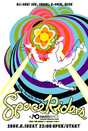 [ SPACE RIDERS -Party People's Party- ] DATE: 2006.6.10 SAT 22:00OPEN/START VENUE: NAKED-SPACE( http://www.naked-space.com ) DJS: OKUIJUN,CHORI, K-SHIN & MICH FEE: 2000YENw/1d + 1Lot ダンスミュージックをこよなく愛するOKUIJUN+ CHORIが毎月開催するパーティー「SPACE RIDERS」。いまや全国区、そして向かうところ敵あり、そんな松江のオリジネイターとして古くから活動する2人によるニュータイプ・ラボ。 MAYU, IDAKICHI, K-SHINを加えたフレッシュネスなメンバーで毎月土曜の夜@松江をお騒がせいたします。 今回(6