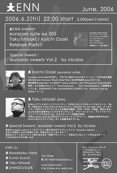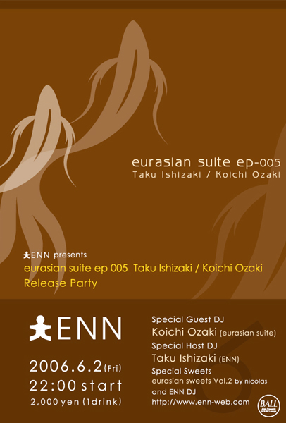 今回はENNにとって記念すべき日!ENNのレジデントである私いしざきが、eurasian suiteレーベルよりオリジナル・トラックをリリースしました!!今回は、そのリリースを記念して、同じ12inch「eurasian suite ep 005」に楽曲を収録されているレーベルオーナーの尾崎 浩一さんをお招きして盛大にリリースパーティーを行います!!