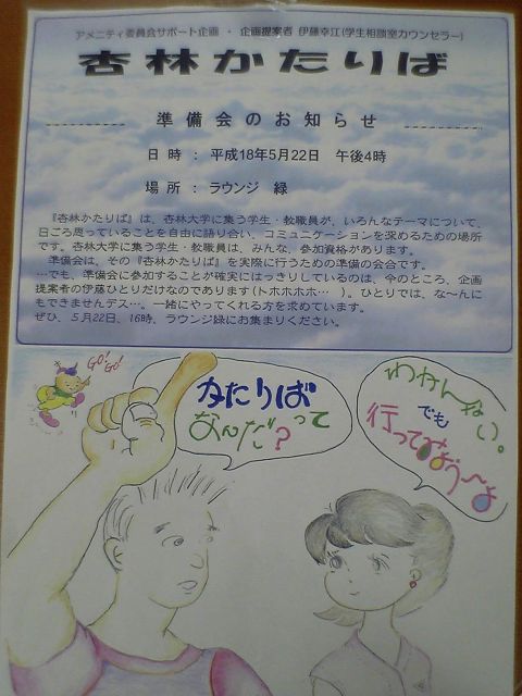 アメニティー委員会の企画の一つである 『杏林かたり場』イベントを行います!! ココでは普段から考えていること、ぶっちゃけたい事をみんなに伝え、討論をしていくイベントです。 NHKの真剣十代しゃべり場の模倣だと考えていただいてOKですw 前回討論した内容は ・杏林大学の良いところ。悪いところ。 ・好きな大学の授業。嫌いな授業。 ・杏林大学に欲しい設備。 ・学食について。 ・ポスト小泉について。 などです。前回は第一回目ということで、雑談がメインになってしまいましたが、どんどん内容を掘り下げて討論できるようにして