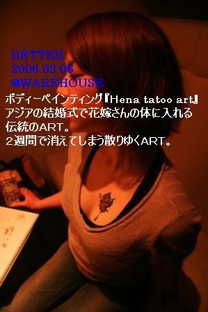 BETTER{より良い・・}をグランドテーマとし、音、照明、映像、ファッション、空間、パフォーマンス、コスメ、食・・・あらゆる角度からBETTERを追求し、クラブに行きなれない人にも楽しんでもらえる空間を提案。 BETTER http://mixi.jp/view_community.pl?id=510030 2006.6.5 MON(毎月第一月曜日) @WAREHOUSE 今回からさらにバージョンアップ!! ブース拡大!!! まずは大好評!! ボディーペインティング『Hena tatoo art』 アジアの結婚式で花嫁さんの体に入れる伝統のAR