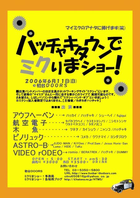 6月11日(日) 東京・初台DOORS http://www.livebar-the-doors.com/ ハッチャキさんぺーじより抜粋 ★2006年6月11日(日)東京・初台DOORSにて 『ハッチャキタウンでミクりまショー』が決定! 予定を空けておいてね! http://mixi.jp/view_diary.pl?id=93584547&owner_id=375845 出演は…あぁなんて素晴らしいメンツでしょう! ピノリュック 木魚 アウフヘーベン 航空電子 ASTRO−B VIDEOーrODEOだぁ!!! 開場PM5:00、開演PM5:30 前売り\3000 当日\3500 メッセージにて