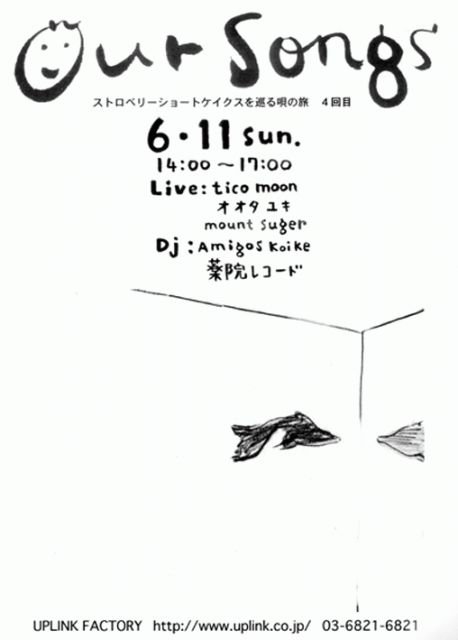 our songs「映画ストロベリーショートケイクスを巡る唄の旅」その第4回 6/11(日)“UPLINK FACTORY” 14:00~17:00 ¥1,800(1ドリンク付) LIVE:オオタユキ、tico moon、mount sugar DJと映像:小池アミイゴ&薬院レコード *ストロベリーショートケイクス http://www.cineamuse.co.jp/cinema/index.php?cinema_id=362 ★御予約はUPLINKまで、 開場の一時間前より受付にて整理券の配付開始(先着60名) 今回のゲストは tico moon とオオタユキ。 この2組をひとつの時間の中で是非聴いてみたい。そんな願いをカタチにしま