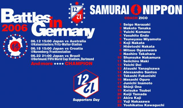 いよいよ日本戦が近づいてまいりました。 「Heartbeat」で一緒に日本代表を応援しましょう! 6月12日(月) 21:50〜24:25 NHK総合 2006FIFAワールドカップ・F組 「日本×オーストラリア」 6月18日(日) 21:35〜24:30 ABCテレビ 2006FIFAワールドカップ・F組 「日本×クロアチア」 ※VSブラジル戦は予定しておりません。 ※日本代表が得点するたび、ワンドリンクサービス券を差し上げます! 皆様、お誘い合わせの上ご来店下さい!