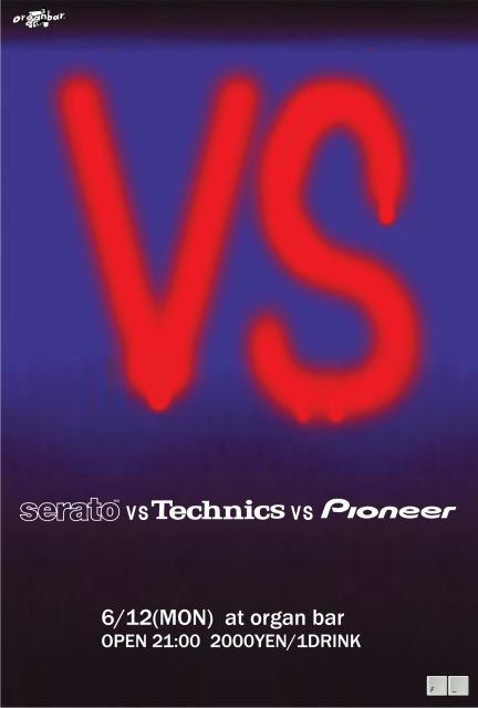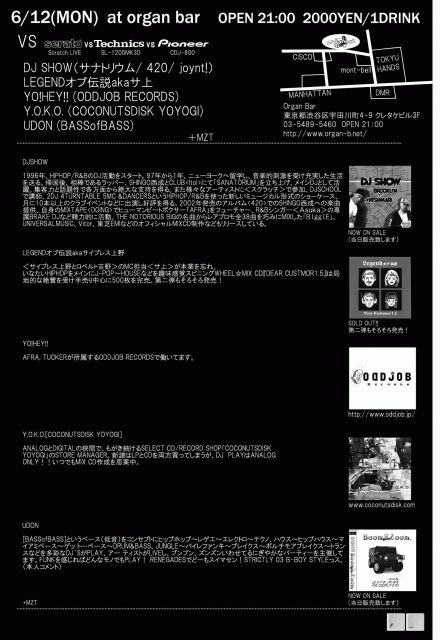 VS serato [SCRATCH LIVE] VS Technics[SL-1200MK3D] VS Pioneer [CDJ-800] 2006/06/12(月曜日) OPEN 21:00 2000YEN/1DRINK DJ: DJ SHOW(サナトリウム/ 420/ joynt!) LEGENDオブ伝説akaサ上 YO!HEY!! (ODDJOB RECORDS) Y.O.K.O. (COCONUTSDISK YOYOGI) UDON (BASSofBASS) +MZT http://www.organ-b.net