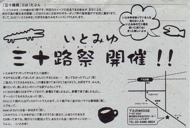 ITOMIYU BirthedayParty of 30 years old “みそじまつり” 2drink \2,000【30歳の人:1drink \1,000】 DJ:shoko(Nico-Mat.) shingo(watergun) tamura(jetter3) mikko(quinka,with a yawn) anzai(MONARCH RECORDS) gen(gentle) ...and more!! VJ:noriyuki(buzz edge) ============================================== 「いとうみゆき」の30歳を祝う祭りです。 宇田川スイーツの店長である彼女が、 自分による自分の為の誕生会を開催! この日のために日本中のギターポップ界の 猛者達が下北沢に集まります。 そして、DJは