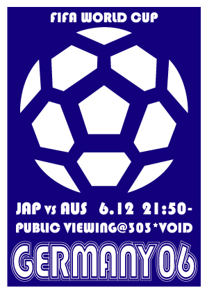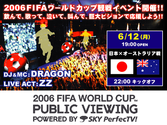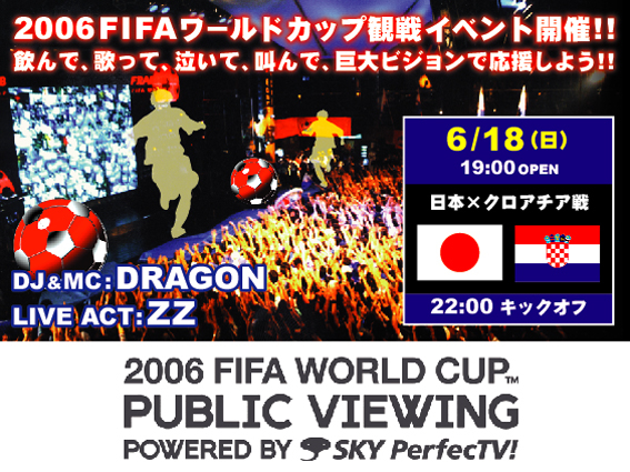 告知失礼致します。 東京六本木のvelfarreにて2006FIFAワールドカップ観戦イベントを開催!! 国内最大級の巨大ビジョンで完全生中継!! 開催概要: ■イベントタイトル: 2006 FIFA WORLD CUP PUBLIC VIEWING POWERED BY SKY PerfecTV! ■日時: 6月12日(月) オーストラリア対日本戦 開場:19:00 キックオフ:22:00 終了予定: 24:00 DJ&MC:DRAGON / LIVE ACT:ZZ 6月18日(日) 日本対クロアチア戦 開場:19:00 キックオフ:22:00 終了予定: 24:00 DJ&MC:DRAGON / LIVE ACT:ZZ 6月22日(木) 日本対ブラジル戦 開