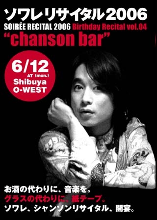今年も恒例の6.12です。4年前と同じ!やはりサッカーとバッテイングですが、開始前に是非見てほしいステージです! マドレーヌエージェンシーより正式デビューが決定した。 Le Petit(=宮里卓とマドレーヌサウンド)も必見です! ソワレリサイタル2006 〜chanson ba〜Birthday Recital VOL.4 2006年6月12日(月曜日) 18:45開場 19:30開演 22:00終演予定 会場:Shibuya O-WEST(03-5784-7088) http://www.shibuya-o.com/ 料金(ドリンク別)/前売&メール予約 4000円、当日4500円 出演/ソワレ 演奏/ 第一部〜ピアノ/