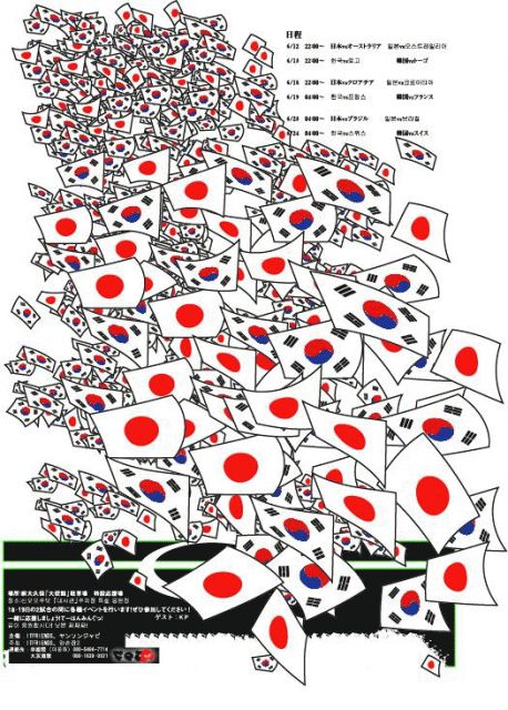 2006ワールドカップもようやく始まりました! ほかでもなく、今回の2006ドイツ・サッカーワールドカップの際に、日本人も韓国人も関係なくたくさん集まって、 日本の試合も韓国の試合も応援し、これを機に交流を深めようというイベントがあります! 場所:新大久保(東京)「大使館」駐車場 特設応援場 (「大使館」飲食店の中、1・2階にても上映予定) 画面:300inch 可能収容人数:約300〜500人(2002年ワールドカップのときは店の駐車場・中・周りを含め、約1500人集まったそうです。 ちなみに5月26日の韓国対ボスニア−ヘルツェゴビナ