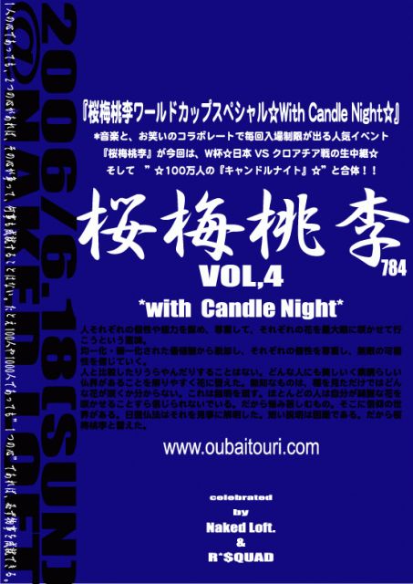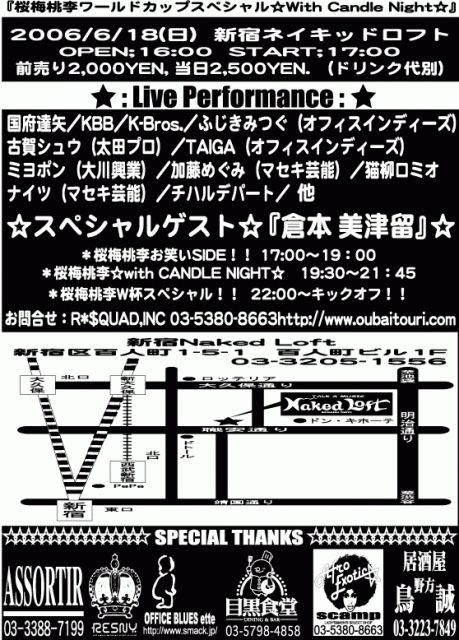 音楽と、お笑いのコラボレートで大人気のイベント「桜梅桃李」が、6/18はw杯「日本VSクロアチア」の生中継と「100万人のキャンドルナイト」http://www.candle-night.org/と合体します☆ スペシャルゲストに「倉本美津留」さんを迎え、お笑い陣営も、さらにスケールアップ!! 出演 国府達矢/KBB/K-Bros./ふじきみつぐ(オフィスインディーズ) 古賀シュウ(太田プロ)/TAIGA(オフィスインディーズ) ミヨポン(大川興業)/加藤めぐみ(マセキ芸能)/猫柳ロミオ 他スペシャルゲスト多数出演!! ダウンタウンの「ひとりごっつ」