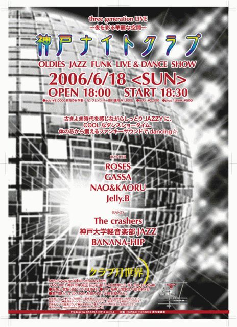 母校の皆様、お時間があれば是非お越し下さいませ!! 僕は、BANANA-HIPでドラム担当してます☆ がんばるぅぅぅぅぅぅぅぅぅ!!!! 管理人様、イベント告知まずければ削除お願い致します♪ 神戸ナイトクラブ three generation LIVE ≪夜を彩る華麗な空間≫ 古きよき時代を感じながらしっとりJAZZYに、 COOLなダンスショータイム、 体の芯から震えるファンキーサウンドでdancing☆ 【dancer】 ・ROSES ・GASSA・NAO&KAORU ・Jelly.B 【band】 ・The crashers・神戸大学軽音楽部JAZZ ・BANANA-HIP OPEN18:00 START18:30 adv \