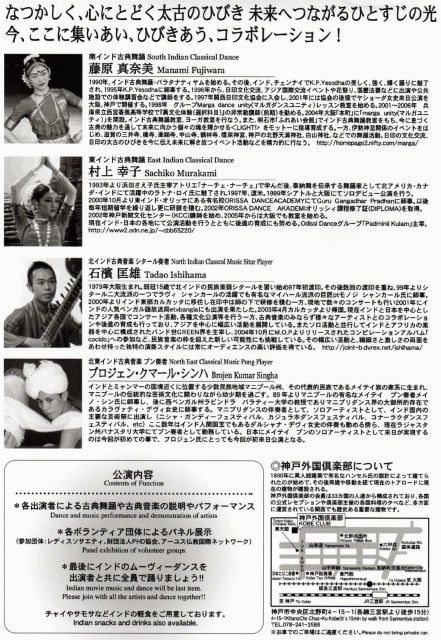 INDIA・太古のひびき at the 神戸外国倶楽部〜スペシャル雨季まつり〜 OPEN14:30〜 START15:00〜(19:30終了予定) at 神戸外国倶楽部 http://www.kobeclub.org/ 神戸市中央区北野町4−15−1 (各線三宮駅より徒歩15分、トアロードを山の方に進み、山本通りを越えて左手にあります。) (お車でのご来場はご遠慮ください。) 《CAST》 藤原真奈美/南インド古典舞踊 バラタナティヤム http://homepage2.nifty.com/marga/index.htm 村上幸子/東インド古典舞踊 オリッシィ http://www2.