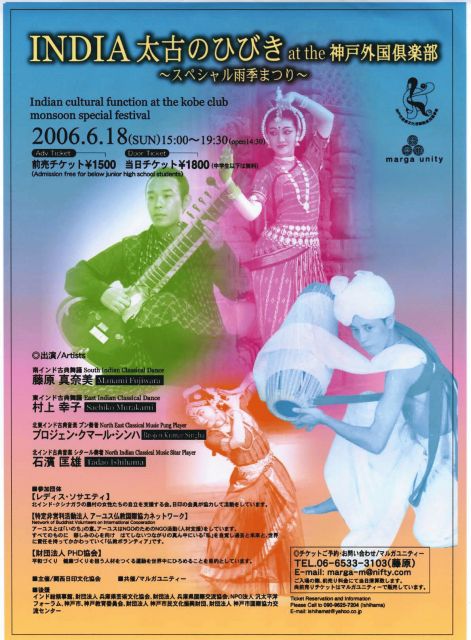 INDIA・太古のひびき at the 神戸外国倶楽部〜スペシャル雨季まつり〜 OPEN14:30〜 START15:00〜(19:30終了予定) at 神戸外国倶楽部 http://www.kobeclub.org/ 神戸市中央区北野町4−15−1 (各線三宮駅より徒歩15分、トアロードを山の方に進み、山本通りを越えて左手にあります。) (お車でのご来場はご遠慮ください。) 《CAST》 藤原真奈美/南インド古典舞踊 バラタナティヤム http://homepage2.nifty.com/marga/index.htm 村上幸子/東インド古典舞踊 オリッシィ http://www2