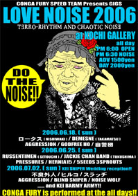 CONGA FURY Presents [ LOVE NOISE 2006 ] 毎年恒例三週連続暴走ナイト!! 各日 PM 6:00 OPEN / PM 6:30 START : ADV 1500円 / DAY 2000円 ● 第一夜 : 6月18日(日) 高知 GALLERY ロータス(西脇暴走HC) / DEMESNE(高松うどんHC) GODFREE HO / 自警団 / AGGRESSION ● 第二夜 : 6月25日(日) 高知 GALLERY RUSSENTIMEN(瀬戸内ポンコツスラッシュ) / JACKIE CHAN BAND(高松暴走HC) PRESSURES / HERNIA15 / 5SEEDS 3SPROUTS ● 第三夜 : 7月4日(日) 高知 GALLERY * 池田ケイ(BLIND SNIPER)結婚記念大カバー大会!! AGGRESSION / 不良外人