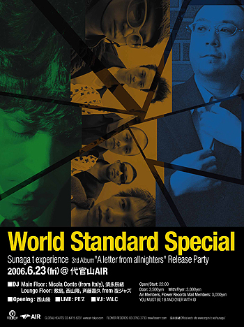 ご存じ「レコード番長」こと須永辰緒のソロ・ユニット<Sunaga t experience>が、待望の3rdアルバム『A letter from allnighters』をリリース。そこで今回は、アルバム・リリース・パーティ"World Standard Special"と銘打ったイベントを開催する。メインフロアDJには須永本人に加え、言わずと知れたJazz シーンの最重要人物Nicola Conteが出演。「Tokyo Exclusive」をテーマとした貴重な空間が代官山AIRを包み込む。さらにLIVEでは大人気Pe'zの出演が急遽決定。<Sunaga t experience>アルバム・リリース・パーティに相応しい豪華な顔ぶれが贈る、