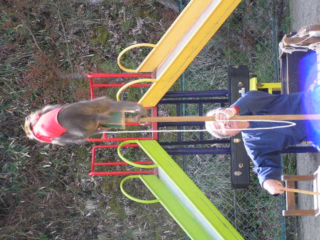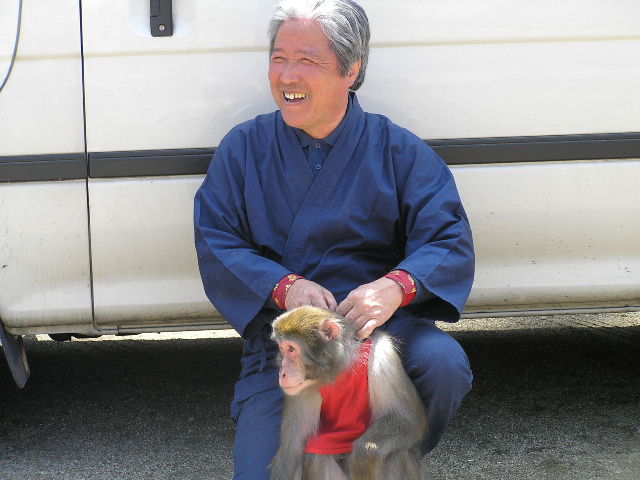 6月24日(土) 吉野見附三茶屋にて 午後1時からお練り歩き 2時〜3時 ほのぼのコンサート 座長:村崎修二(猿回し 歌謡 口上芸) お猿:アトム(♂) 大道芸:上島さん(年齢不詳・♂・人間) だんだん姿を消してゆく昔ながらの猿回しをなんとか残そうと、小沢昭一氏の要請を受けて山口県で調査を進めるうちに、自ら一座を結成した村崎修二さんが今年も吉野にやってきます。 名著「忘れられた日本人」を残した民族学者宮元常一氏に師事し、京都大学霊長類研究員でもある村崎さんの猿まわしは、猿と人の信頼関係の上にある伝
