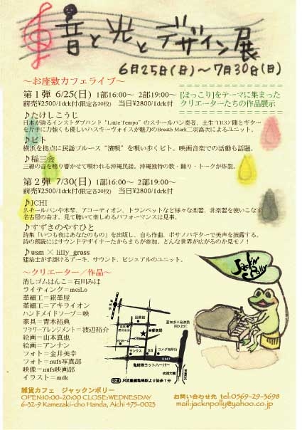 名古屋から電車で30分・・・ 雑貨カフェジャックンポリーにて http://mixi.jp/view_community.pl?id=317011 音と光とデザイン展のオープニングアクト! http://mixi.jp/view_bbs.pl?id=7702429&comm_id=317011 クリエーターさん20名の作品を見ながら、 たけしこうじとともに素敵な時間を過ごしましょう。 日曜日なので早めの時間もご用意しました☆ 和やかな雰囲気の中でのお座敷カフェライブです。 ライブ終了後、夜21:30頃〜カフェからすぐの海で知多の海鮮BBQ&沖縄料理で打ち上げがあります。こちらもドリンク付き別途\2000で参
