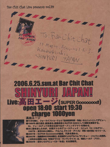 [PARTY of INVADERS] の6曲目に レコーディングゲストとして参加している うすた京介と渕上零。KENKENと3人で 活動している謎のバンド宇宙軒が6/25に ライヴ決定。日本一の前座バンドを目指す 宇宙軒!お楽しみに!! 宇宙軒コミュ http://mixi.jp/view_community.pl?id=525158 お待たせしました! 宇宙軒2006年初ライヴ!! 宇宙軒メジャーデビュー記念?? 『新百合JAPAN!』@Chit Chat LIVE/高田エージ(Super Gooooood!) 前座/宇宙軒 2006.6.25.sun. open 18:00 start19:30 CHARGE 1000YEN Chit Chat