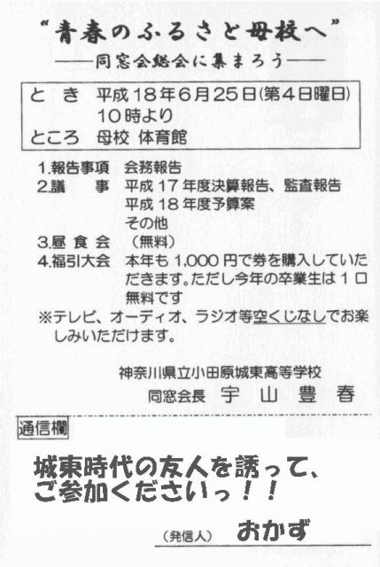 ”青春のふるさと城東へ” というわけで、今月、6月25日(日)に 城東高校同窓会総会が開催されます! 卒業してから顔を合わせてない友達とかいるんではないでしょうか? なかなか皆で顔を合わせる機会とか無いと思います。 年に一度の総会で、楽しい時間を過ごしちゃいましょう! スケジュールとしては↓↓↓ 午前中、会長のありがたい(か?)お話があり、、 会計報告があり、予算案のお話があり、終了。 で、午後です!! この総会の山は午後です!! 無料で昼食が出ます!多分軽食程度だと思うのですが どんなのかはわかり