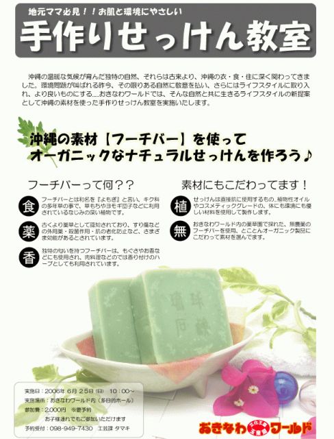 〜フーチバーを使ってオーガニックなオリーブ石鹸を作ろう〜 沖縄県ではあまり耳にしない『手作り石鹸教室』。。。。 市場には月桃の手作り石鹸など、沖縄独特の素材をつかった手作り石鹸が、話題となっていますね♪長寿県、沖縄独特の素材や、廃油ではない植物性オイルを使って、環境にもお肌にも優しい手作り石鹸を作ってみませんか?? 手作り石鹸をカスタマイズするおもしろさや、手作り石鹸のエトセトラなどを学んで頂きます。観光地おきなわワールド内にある、昔しながらの街並みを再現したスペースで開催。赤瓦の古民家を眺め、特製ハ