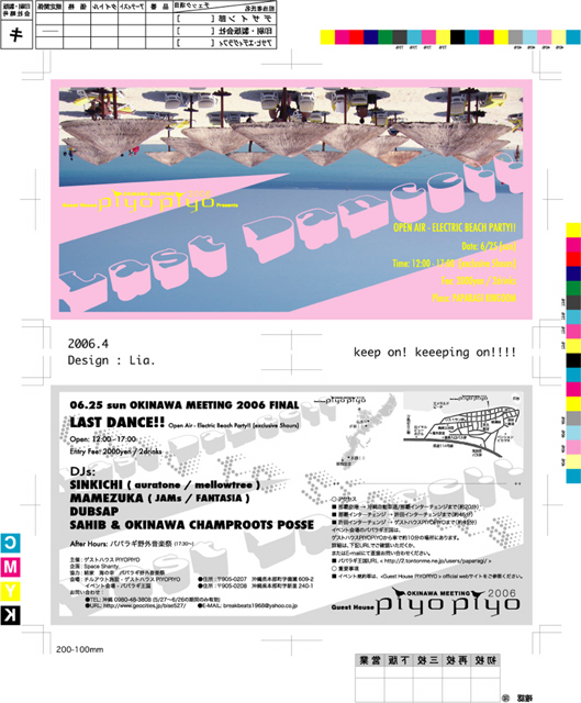 ☆Sinkichi氏出演です♪よろしくお願いします! 日本全国から面白人間が大集合して欲しい♪ 今回、そんな目標をもっての "OKINAWA MEETING" 2006年5月27日より 沖縄の大自然が残る本島北部・本部半島・備瀬に"一ヶ月限定"でオープンしているゲストハウスPIYOPIYO。いよいよクロージング・カウントダウン! ゲストハウスPIYOPIYOクロージングPARTY--2DAYS ・Guest House PIYOPIYO website http://www.geocities.jp/bise527/ ・Guest House PIYOPIYO コミュニティー http://mixi.jp/view_communi