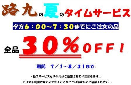 7/1〜8/31まで、毎年恒例のタイムサービスを開催します! 夕方6:00〜7:30までの注文の品が全品30%OFFになるという素敵なタイムサービスです。 ぜひこの機会をお見逃し無く。