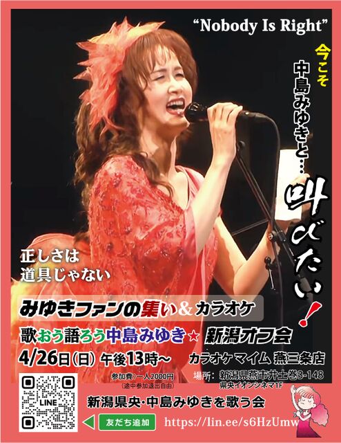 中島みゆきと 『同じ時代に生まれてうれしい』 そんな思いの方ならどなたでも! □時:4月26日(日)午後13時〜17時(19時頃まで延長可・途中入退出自由) □所:カラオケマイム燕三条店 燕市井土巻3-148イオンシネマ・ワーナーマイカル1F(飲食物の持ち込みは不可です) □参加費:1人 2000円 歌うもよし、歌わないでおしゃべり歓談だけもよし。ファン歴の長短にかかわらず、みゆきソングへの思いや、コンサート夜会などの思い出話に花を咲かせましょう! ※参加ご希望の方は下記ライン公式「友だち追加」でお願いいたします。 ライン