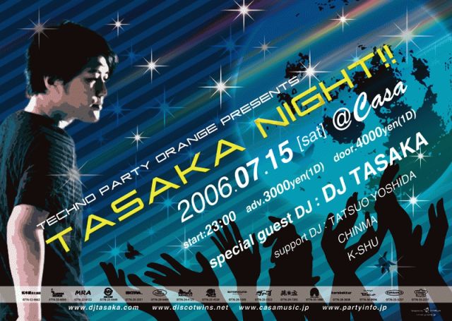 昨夏、「DISCOTWINS」&アルファとして来福し、驚異的な盛り上がりを見せたあの一夜から約一年・・・ http://www.casamusic.jp/gallery20050813.html 日本テクノ界の若武者、「DJ TASAKA」がまたまた福井にやってくる!! 今年も、脅威のウルトラハイテンションなプレイで、熱狂の渦に巻き込んでくれるのは間違いないでしょう☆☆ **party詳細** techno party "Orange" presents TASAKA NIGHT!! 2006.07.15(sat)@CASA(福井県福井市) http://www.casamusic.jp/