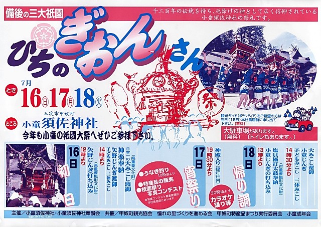 『備後の三大祇園「ひちのぎおんさん」 千二百年の伝統を持ち、厄除けの神として広く信仰されている小童須佐神社の祭礼です。』(チラシより) 下記の日記中にも関連情報を掲載していますので、よかったらご覧下さい。 小童祇園祭写真コンテスト → http://mixi.jp/view_diary.pl?id=155354810&owner_id=4474366 ボランティアガイド(祇園祭案内) → http://mixi.jp/view_diary.pl?id=164255055&owner_id=4474366