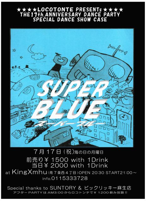 Party Information 〜Bar Locotonte 17s Anniversary〜 ++SPECIAL DANCE SHOW CASE 「SUPER BLUE」 日時:7月17日(祝)海の日 場所:北海道札幌市中央区南7条西4丁目キングムー システム:前売り \1500 with 1drink 当日 \2000 with 1drink DJ:MIKU KOSUKE DUST BOXX SOUL WEED ATOMY MOTOO ONSEN KAZU JUNICHI GO-KI MASATO チケットのお求め・お問い合わせはBar Locotonteまで。 住所:南7条西4丁目ススキノ会館ビル4F Tel:011−533-3728 *アフターパ