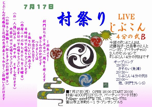 村民のみなさん集合〜〜〜 『村門』は一周年を迎えました 17日は、じぶこんが出演の 『村祭り』 でお祭り騒ぎをしませう^^ 今回は急に決まったので、じぶこんは二人(近藤、辻)です…が!!! 前回参加のベンちゃん(アペラッチャコ)が打・打・打・打・打で参加です その名も 『じぶこん:4分の弐B』 先日、3人でのリハーサルがありましたが 3人でのじぶこんも楽しいですよ^^ ベンも弾けまくって… ヤバイっす!!!! そしてパーティーのオープニングは 『さすらい(魚津)』が演奏します 彼らはアースデ