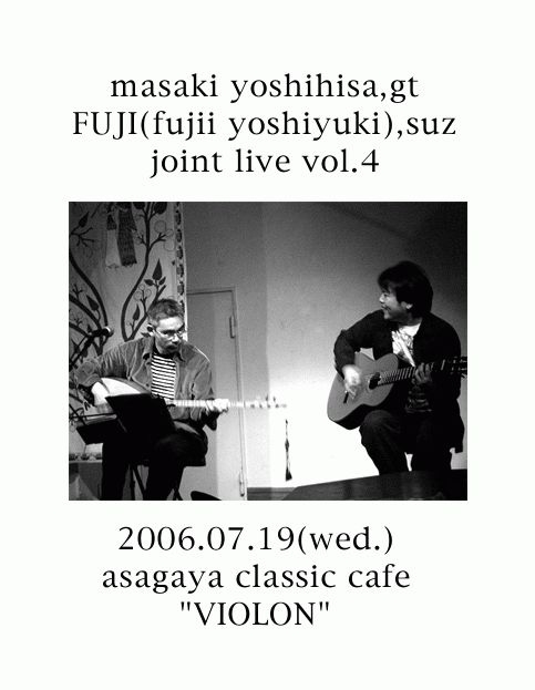 毎度失礼します、ギターの吉久昌樹と申します。 ライブの告知をさせてください。 お馴染み「日本一のサズ奏者」FUJIこと藤井良行さんとのジョイントライブ、4回目です。 2006/07/19(水) 『吉久昌樹gt&FUJI suz joint live vol.4』 ・FUJI(藤井良行)suz solo ・吉久昌樹gt solo ・吉久昌樹gt+FUJI suz duo 阿佐ヶ谷名曲喫茶ヴィオロン 杉並区阿佐谷北2-9-5 03(3336)6414 19:00start ¥1.000(1drink付) 地図 http://qkunnet.hp.infoseek.co.jp/violon.gif 吉久は即興を交えたオリジナル曲とカバー曲を、 FUJIさんはトルコ大衆音